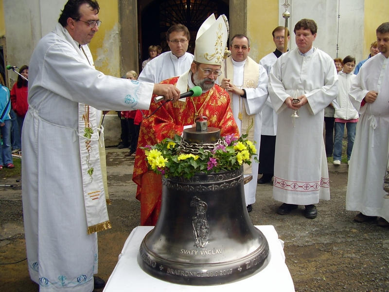 Kostel Všech svatých Barokní jednolodní kostel, patřící Římsko katolické farnosti Zbečno, byl postaven v letech 1780 – 1783 zednickým mistrem J. Cikanem z Bud. Před tím stál zde kostelík na hřbitově, který dnes již neexistuje. Farní je kostel od r. 1855. Orientovaná stavba stojí na návsi – obdélníková loď se skosenými hranami, k níž přiléhá na východě kněžiště se sakristií, na západě je jednopatrová věž. Na rozích budovy jsou barokně jonské pilastry. Vchody jsou tři, pod věží severní, do sakristie a do schodiště u věže. Hlavní oltář je z r. 1859. Bokové oltáře pochází ze zrušeného pražského kláštera. Kazatelna je dřevěná. Mimořádně cenný je původní barokní krov z r. 1782.Již v roce 1980 byl konstatován havarijní stav kostela. Stávající prejzová krytina je stará, při deštích hrozí zatékání do kostela.Při odkrytí krytiny bylo zjištěno vážné poškození krovové konstrukce. Oprava začala v roce 2001 a vzhledem k nedostatku finančních prostředků je rozdělena na několik etap. V současné době je hotova asi 1/3 prací. Oprava bude probíhat cca 6 let. Finančními příspěvky se podílejí Ministerstvo kultury ČR, Krajský úřad Středočeského kraje, ŘKF Zbečno a Obec Bratronice. Po skončení akce „Střecha“ je zapotřebí provést odvodnění budovy a opravit fasádu. Původní zvony v kostele byly za válek zrekvírovány. Proto byla v roce 2007 uspořádána veřejná sbírka, z níž byl pořízen nový zvon sv. Václav, který byl dne 28.9.2007 vysvěcen a uložen do věže kostela. V kostele probíhají pravidelně každou sobotu bohoslužby za účasti zbečenského vikáře P. Jána Petroviče.
